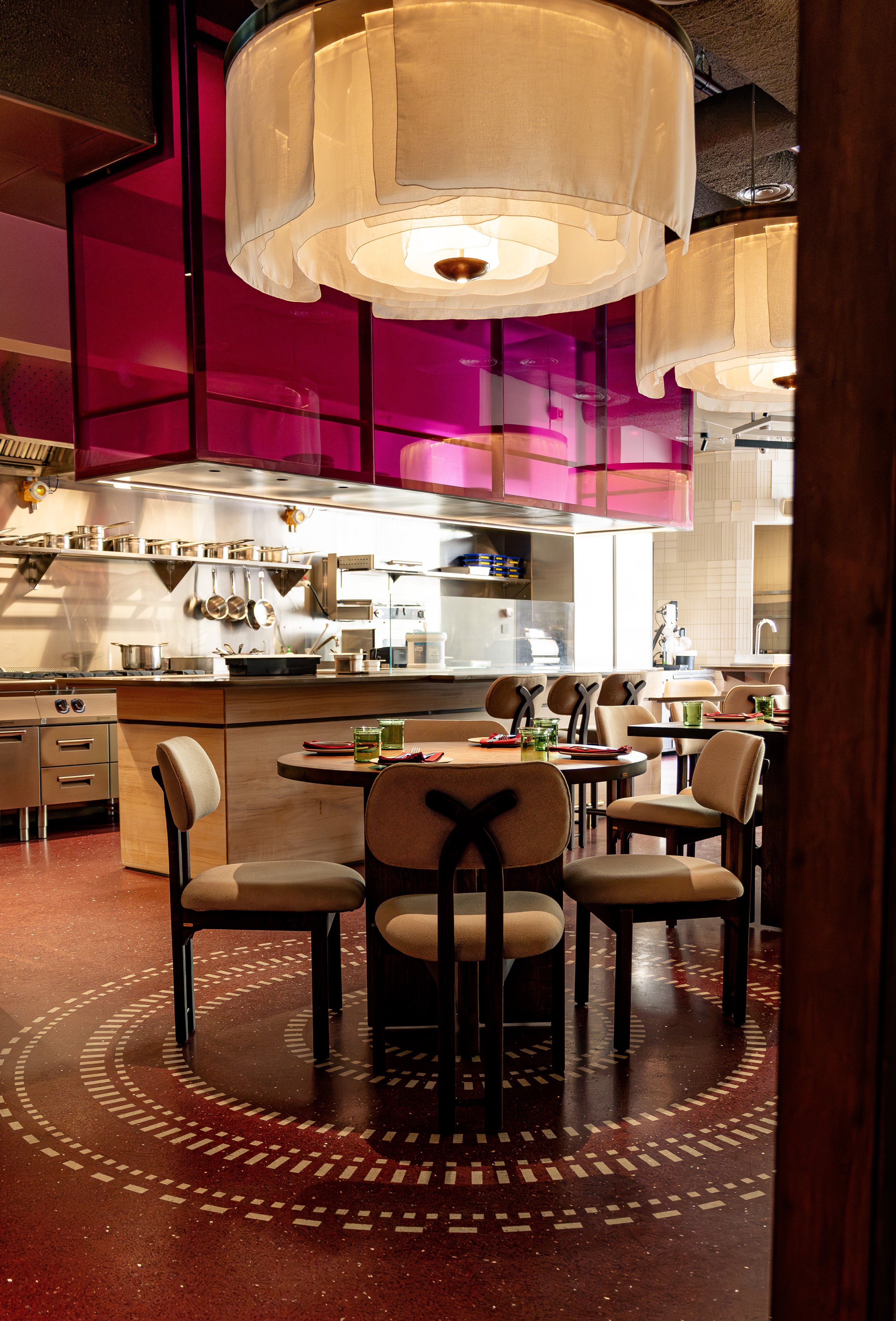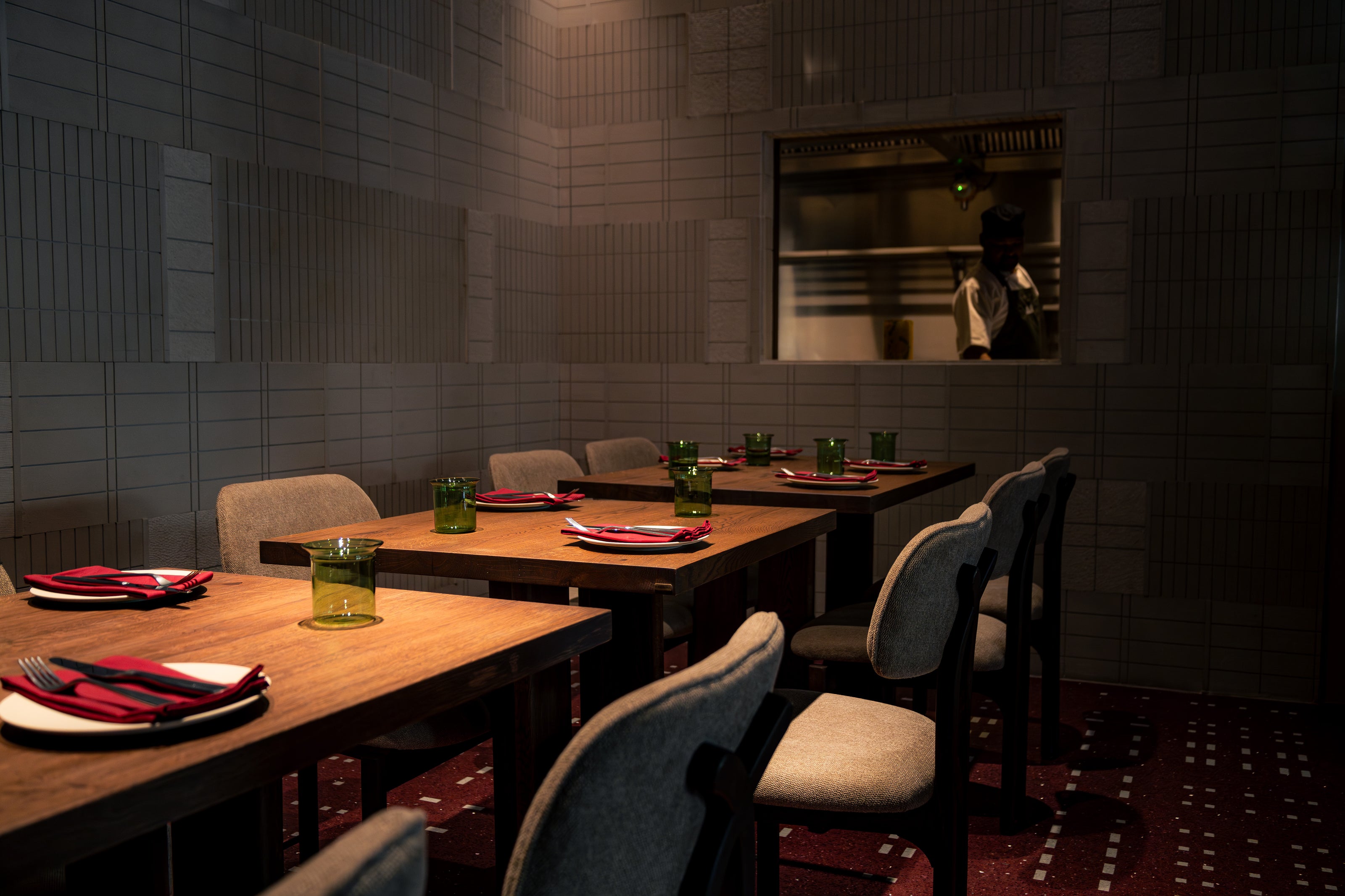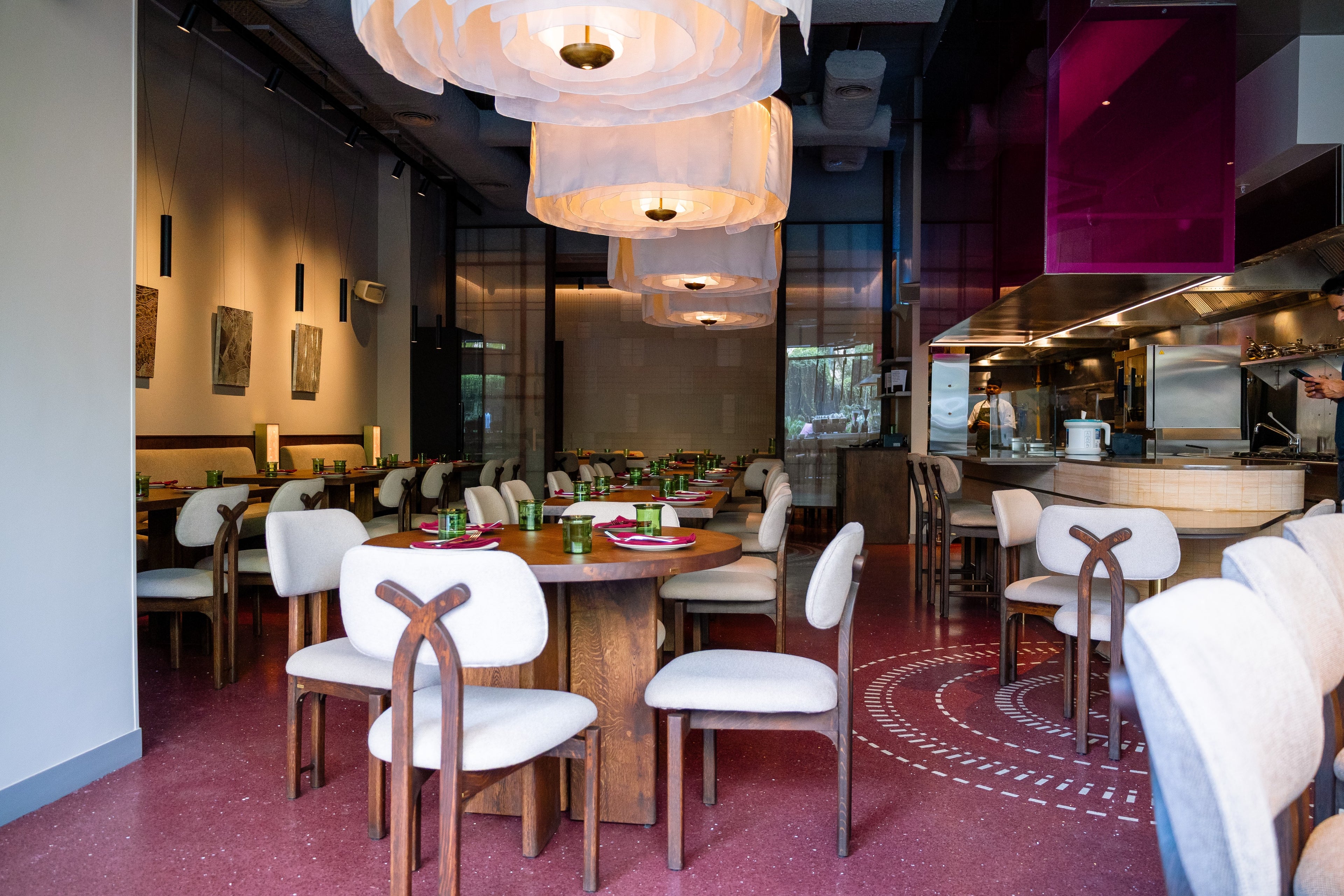 Nestled in Gurugram, Anjeer is more than a restaurant—it’s a contemporary rendition of Indian culinary heritage, where textures, colors, and spaces softly converge. Guests are embraced by introspective design elements: whisper-thin kantha-embroidered glass panels, layered terrazzo ripples, and warm textiles that comfort without ornament. The open kitchen bridges the boundary between food and guest, transforming each meal into an intimate, sensory moment.