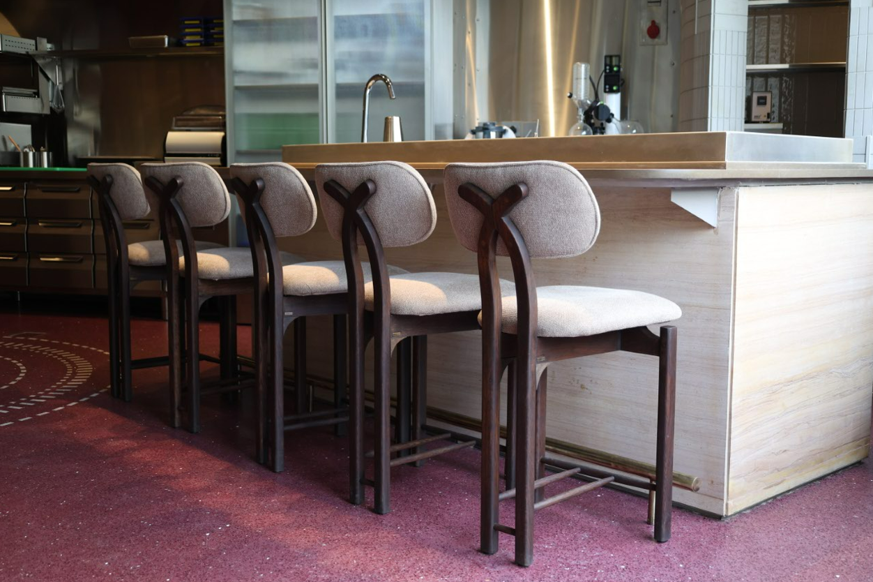 Solid Bench carried forward Anjeer’s narrative of tradition and contemporary refinement into the furniture — timeless pieces designed with understated elegance. Custom-designed chairs feature Anjeer’s signature ‘A’ subtly integrated into the backrest, crafted in high-grade oak with uniquely detailed legs. A large solid-wood dining tables and a thoughtfully crafted host desk complete the space, complementing the sandstone palette and adding depth to the café’s layered geometry.