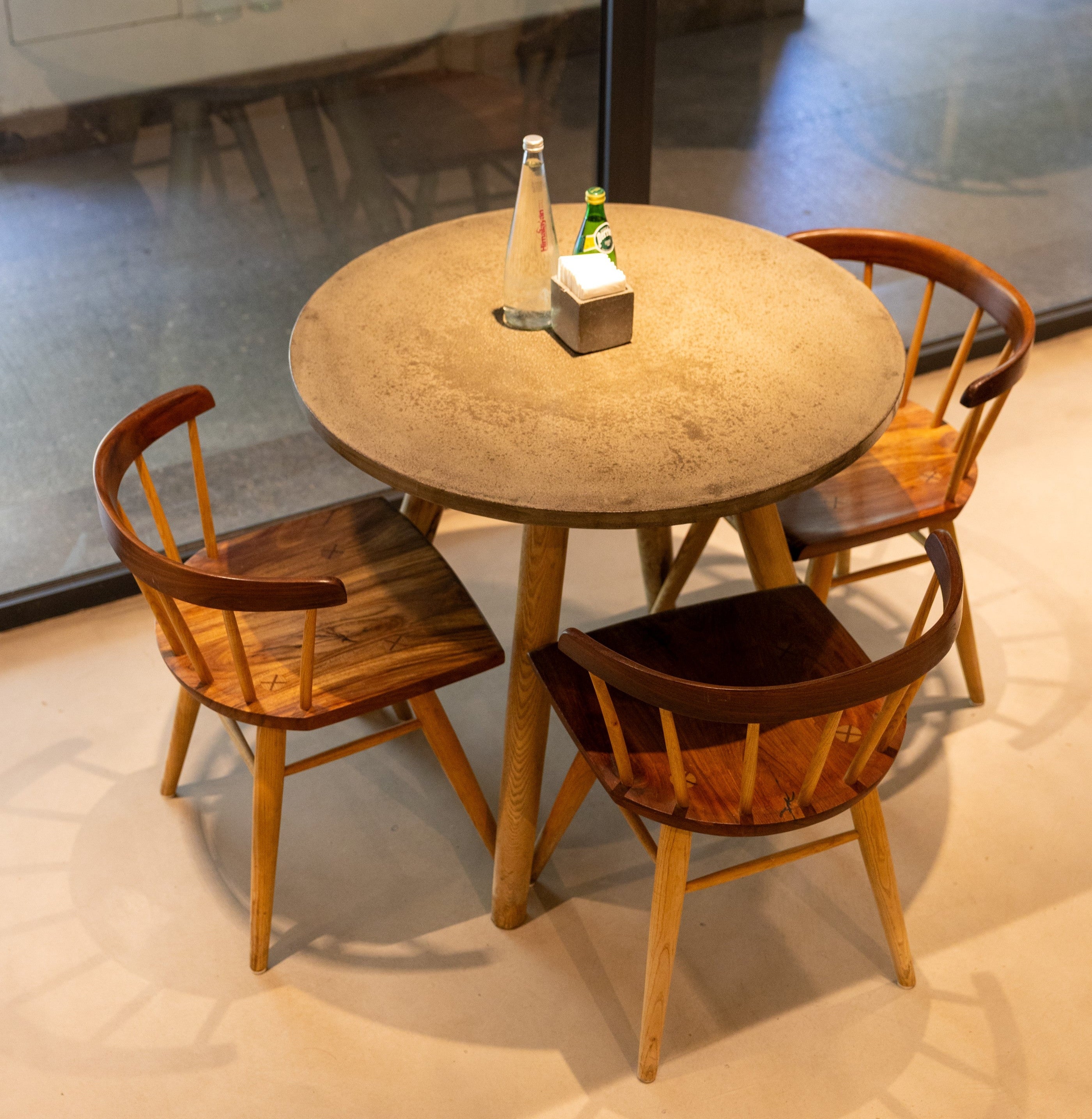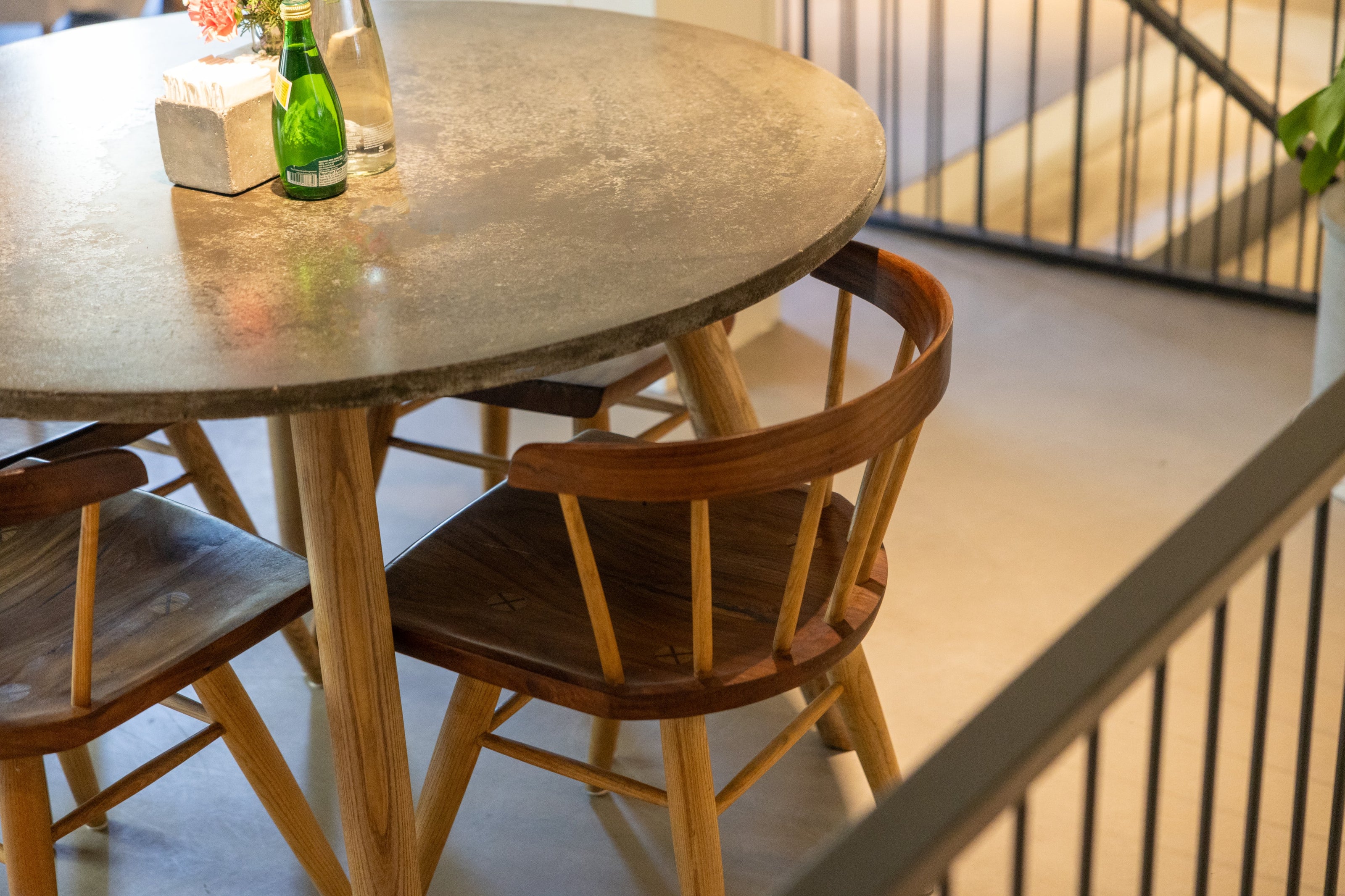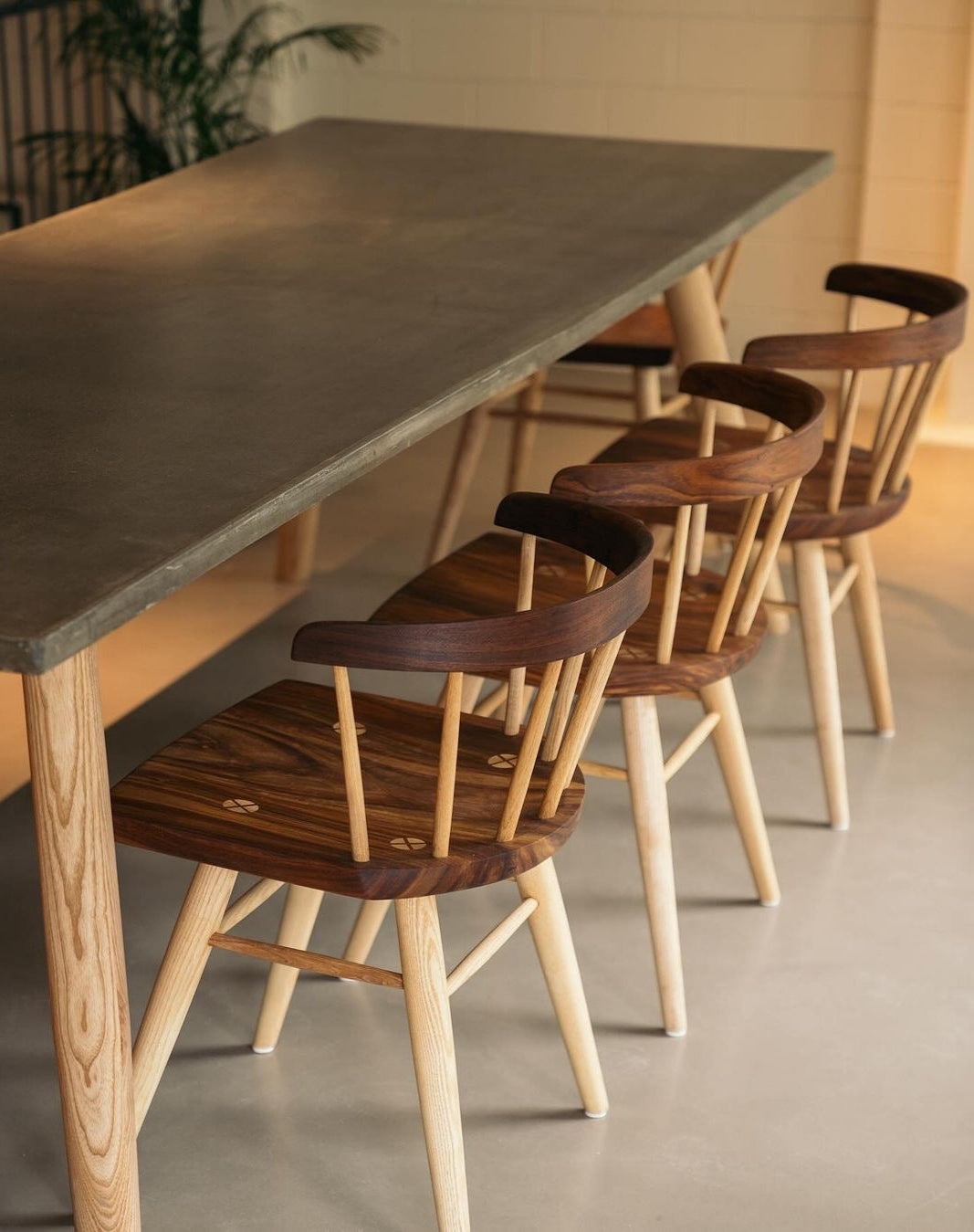 To match Fig’s serene spirit, Solid Bench created pieces that breathe with the space, grounding it with natural textures and quiet design. Inspired by Japanese minimalism, our low-back Windsor chairs with their distinctive rosewood-and-ash spindles have become synonymous with Fig. Benches draw from Nakashima’s timeless architecture, while concrete tables anchor the space, inviting slow mornings and unhurried conversations.