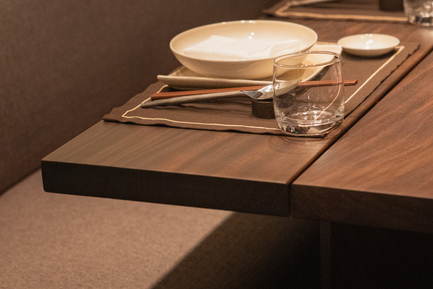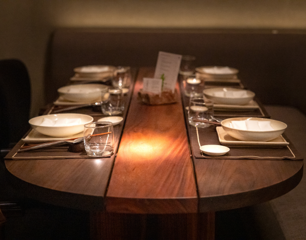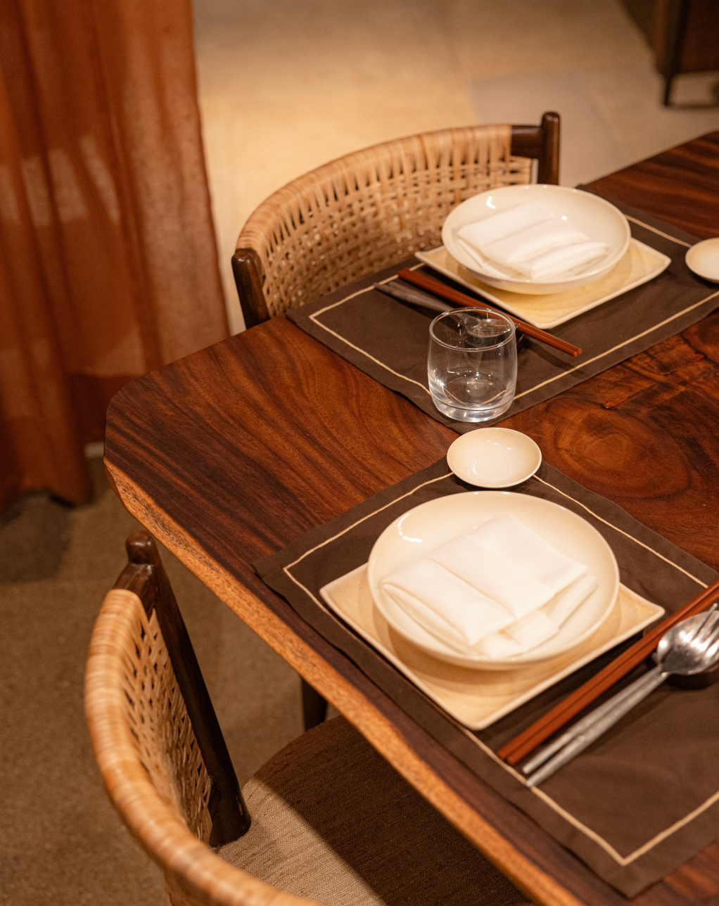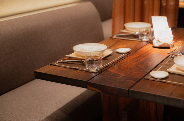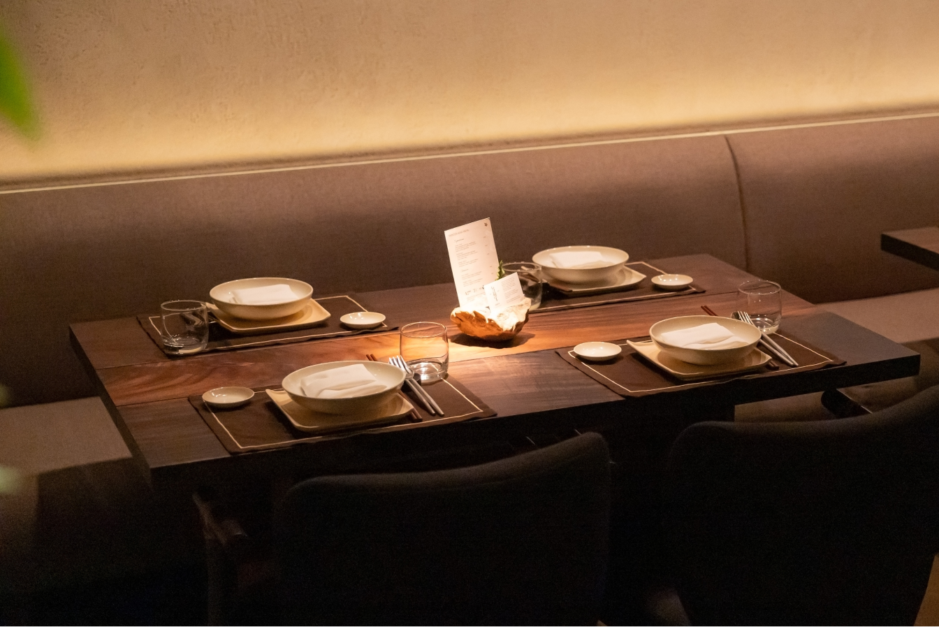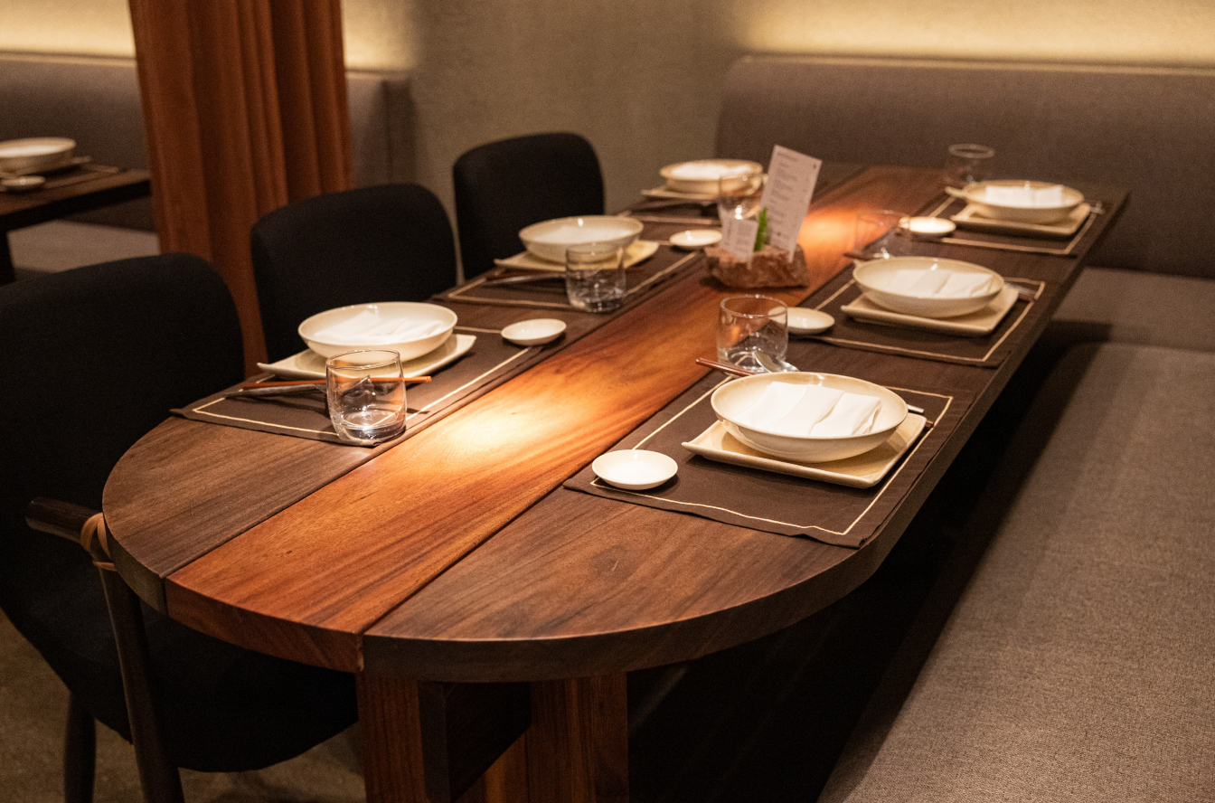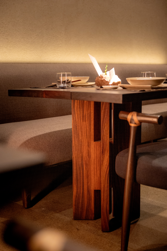 Solid Bench embraced Kaméi’s refined Japanese aesthetic by designing furniture that harmonizes with its earthy tones, rattan accents, and brass details. The tables feature a striking play of contrast, with darker wood on the outside and light natural tones inside, creating a subtle yet dynamic interplay of color. A large live-edge community table becomes the focal point, paired with sleek silhouettes and plush upholstery that balance comfort, functionality, and spatial flow — all contributing to Kaméi’s warm, elegant, and immersive dining experience.
