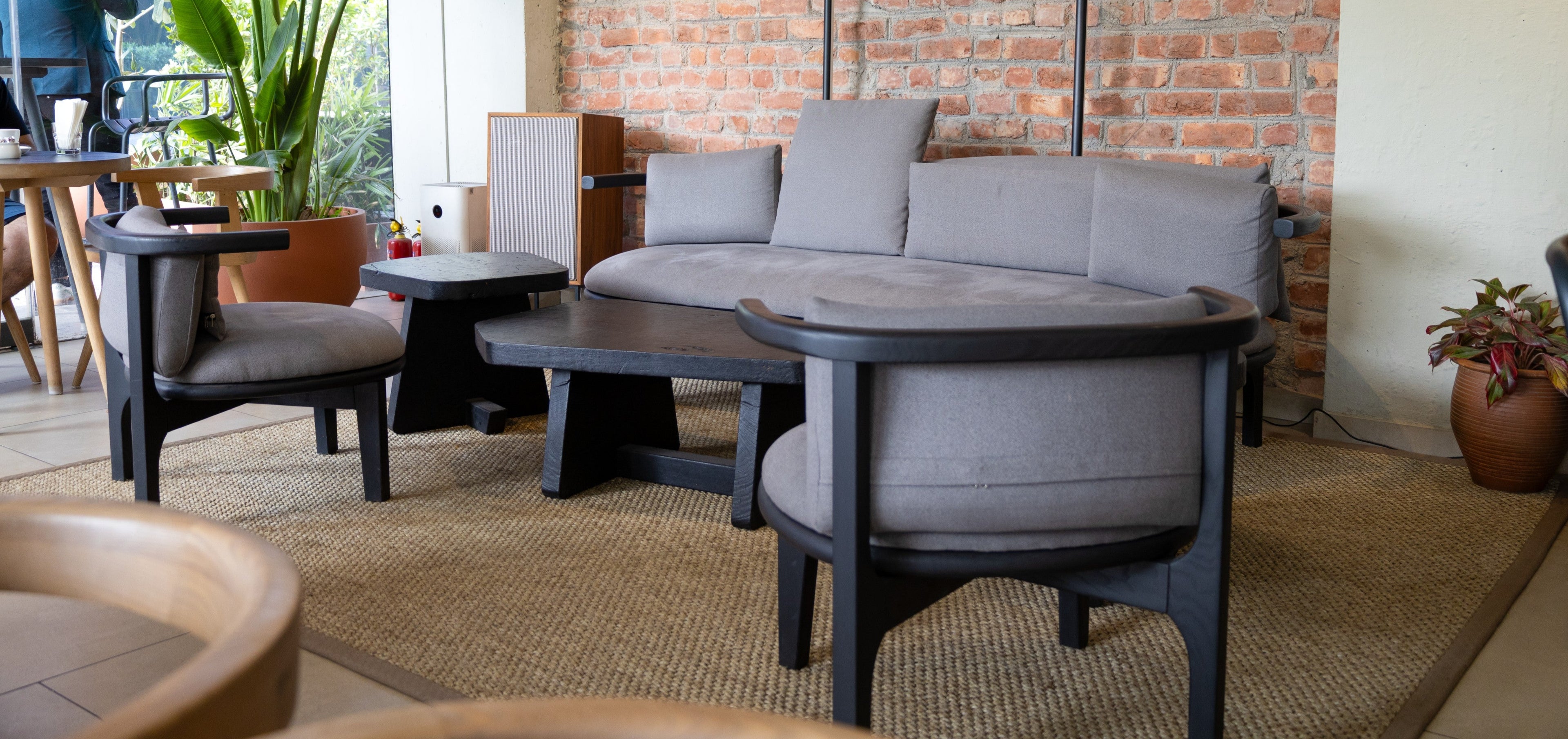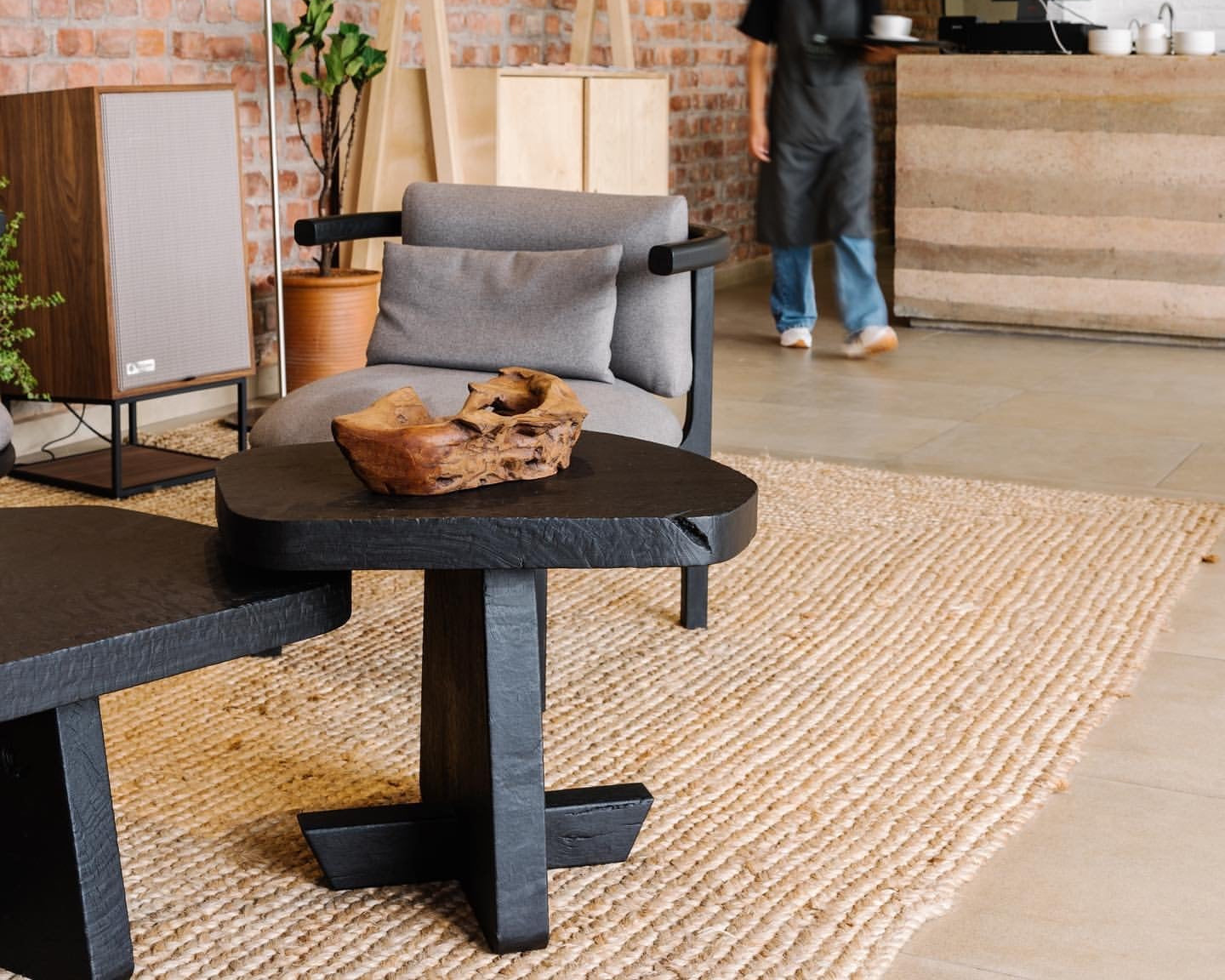 The heart of the café is a relaxed seating zone featuring our custom-crafted loungers paired with nested coffee tables in burnt eucalyptus. This inviting arrangement encourages guests to pause, gather, and linger, making it a rare and memorable experience in a café setting.