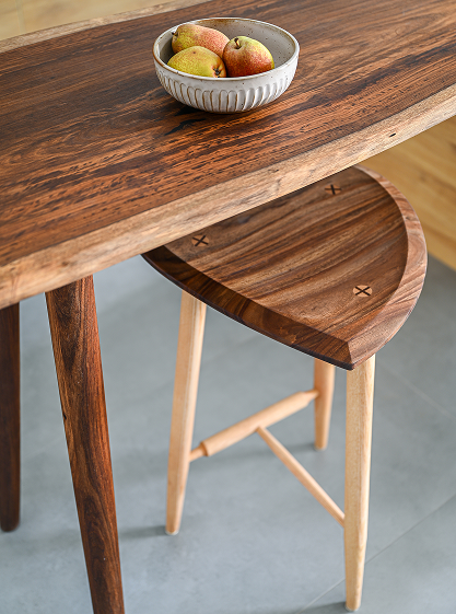 We partnered with Vedanth Design Studio as they sought out to put together a clean looking, no fuss kitchen with minimalist functional design and visual interest. Solid Bench designed the live edge wood breakfast counter and paired it with the rustic tall stools adding lot of character to this space.